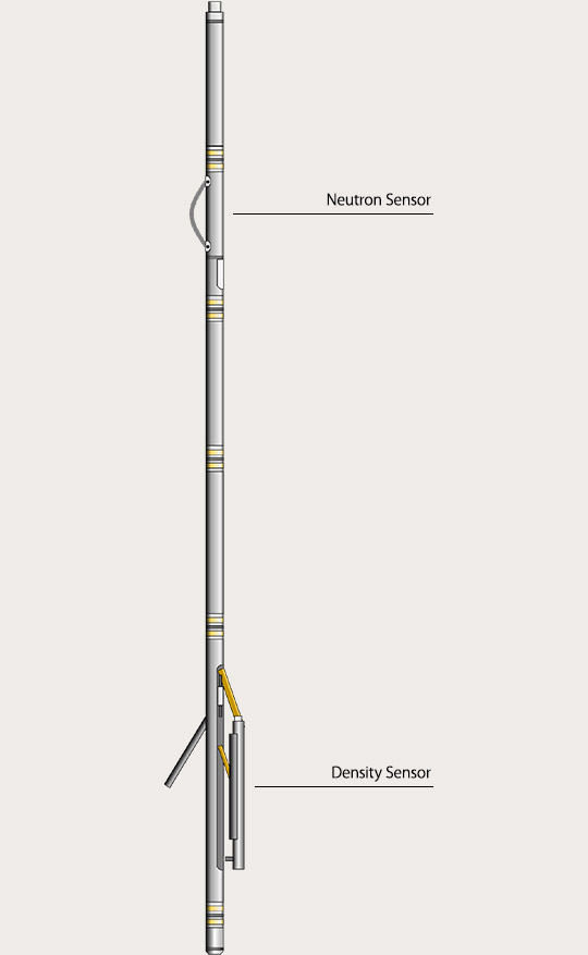 密度検層ツールと中性子孔隙率検層ツールを連結して地層密度と中性子孔隙率を同時に測定することができるツールです(それぞれの測定原理は上述の密度検層と中性子孔隙率検層の説明と同様です)。本検層ツールは坑壁近傍に形成される泥壁の影響を排除する機能を備えており、正確な地層孔隙率、地層密度値を計測します。また、同時に自然ガンマ線強度、坑内温度、坑径の測定が可能です。ツールの外径が63.5mmとスリムなため、HQ孔などの調査井での計測も可能です。